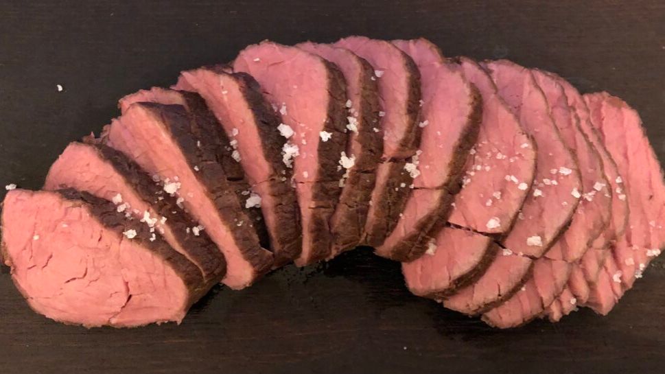 Temperatur svinger også meget og handler især om personlig præference. Generelt tilberedes grøntsager ved minimum 85c, da det først er her fibrene mørnes, mens kød tilberedes fra 50c og op – fisk og skaldyr tilberedes dog ofte ved lavere tempereturer omkring 45-50c. Til rødt kød foretrækker jeg oftest 56c, men afstemmer det gerne til eventuelle gæsters præferencer. Det bedste er at prøve sig lidt frem, og finde den temperatur man bedst kan lide resultatet af. Her ses roastbeef lavet ved 56c.